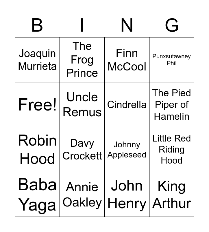 This bingo card has 36 words: Aladdin, Anansi, Casey Jones, Cindrella, The Headless Horseman (Legend of Sleepy Hollow), King Arthur, The Pied Piper of Hamelin, Sacagawea, Free!, Jack and Beanstalk, Little Red Riding Hood, Punxsutawney Phil, Sinbad, Annie Oakley, Davy Crockett, Joaquin Murrieta, The Lock Ness Monster, Sleeping Beauty, Baba Yaga, Finn McCool, John Henry, Mike Fink, Rapunzel, Snow White, Blackbeard, The Frog Prince, Johnny Appleseed, Paul Bunyan, Robin Hood, Uncle Remus, Breman Town Musicians, Hansel and Gretal, Kate Shelley, Pecos Bill, Rumpelstiltskin and William Wallace.