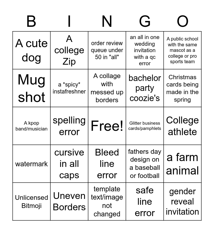 This bingo card has a free space and 24 words: cursive in all caps, Uneven Borders, A collage with messed up borders, Unlicensed Bitmoji, A public school with the same mascot as a college or pro sports team, A cute dog, Mug shot, A college Zip, Glitter business cards/pamphlets, Bleed line error, bachelor party coozie's, A kpop band/musician, fathers day design on a baseball or football, a farm animal, a *spicy* instafreshner, safe line error, College athlete, order review queue under 50 in "all", Christmas cards being made in the spring, spelling error, gender reveal invitation, watermark, an all in one wedding invitation with a qc error and template text/image not changed.