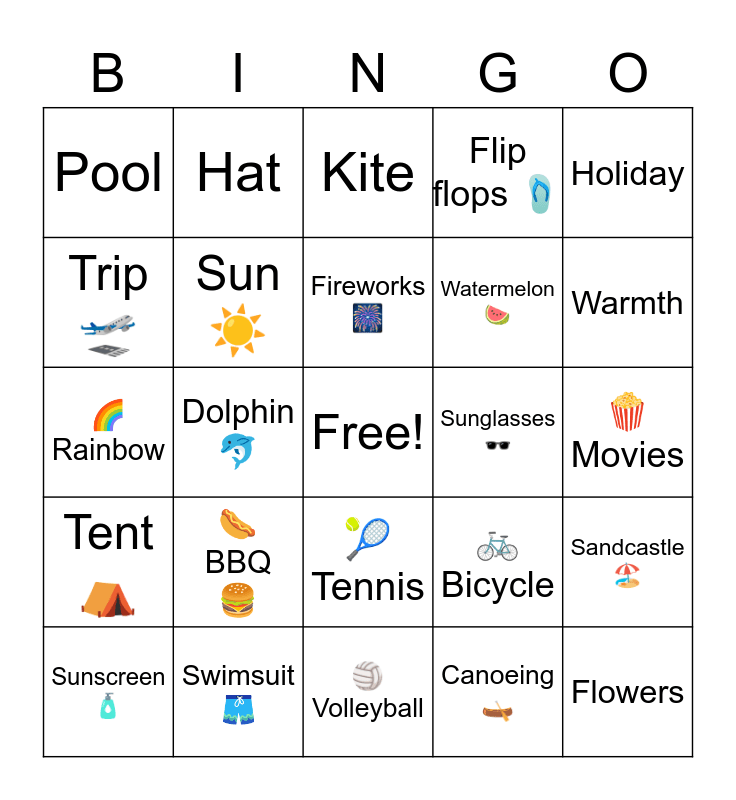This bingo card has a free space and 59 words: Beach π, Swimsuit π©³, Camping π, Tent βΊοΈ, Canoeing πΆ, Waterpark, Sun βοΈ, Swim πββοΈ, Watermelon π, Picnic, Flip flops π©΄, Vacation π, Trip π«, Ocean π, Ice cream π¦, Pool, Flowers, Holiday, Lemonade π, Fireworks π, Sunglasses πΆ, Kite, Sunscreen π§΄, Sandcastle π, Beach Ball, Float π, Popsicles π‘, Surfboard πββοΈ, Warmth, Tan, Air Conditioner π¨, Boating β΅οΈ, Gardening πͺ΄, Humidity π₯, Hat, Travel βοΈ, Backpack π, Dolphin π¬, π Seashell, π Rainbow, β Thunderstorm, π BBQ π, πΏ Movies, β½οΈ Soccer, π Basketball, π Football, βΎοΈ Baseball, π₯ Softball, πΎ Tennis, π Volleyball, π₯ Ultimate Frisbee, π₯ Lacrosse, π€Ώ Scuba Diving, π£ Fishing, π΄ Scooter, π² Bicycle, π³ Cruise, π‘ Carnival and π’ Amusement Park.