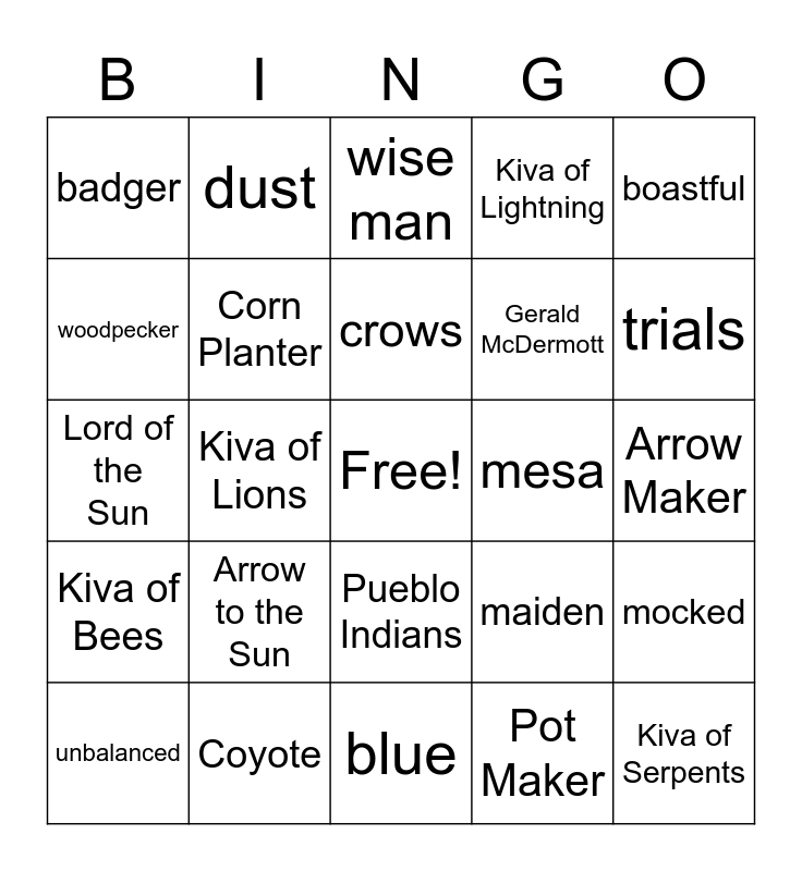 This bingo card has a free space and 24 words: Arrow to the Sun, Coyote, crows, unbalanced, boastful, badger, woodpecker, dust, mesa, Pueblo Indians, Gerald McDermott, Lord of the Sun, maiden, mocked, Corn Planter, Pot Maker, Arrow Maker, wise man, trials, Kiva of Lions, Kiva of Serpents, Kiva of Bees, Kiva of Lightning and blue.
