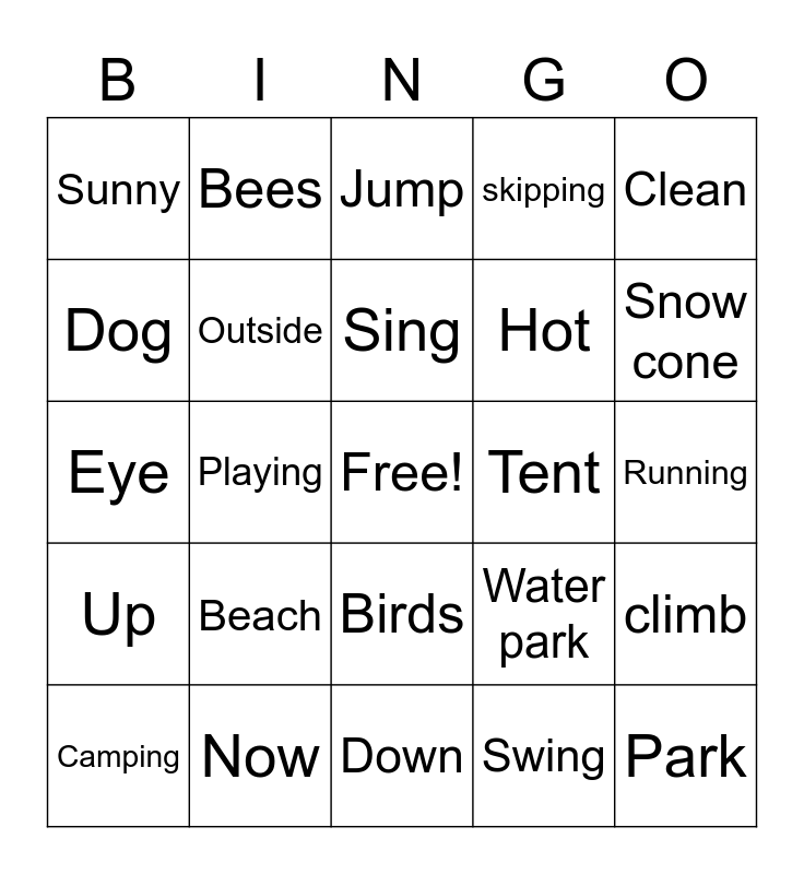 This bingo card has a free space and 24 words: Beach, Now, Sing, Camping, Clean, Sunny, Dog, Bees, Tent, Birds, Hot, Eye, Water park, climb, Outside, Swing, Running, Jump, Snow cone, Playing, Park, Up, skipping and Down.