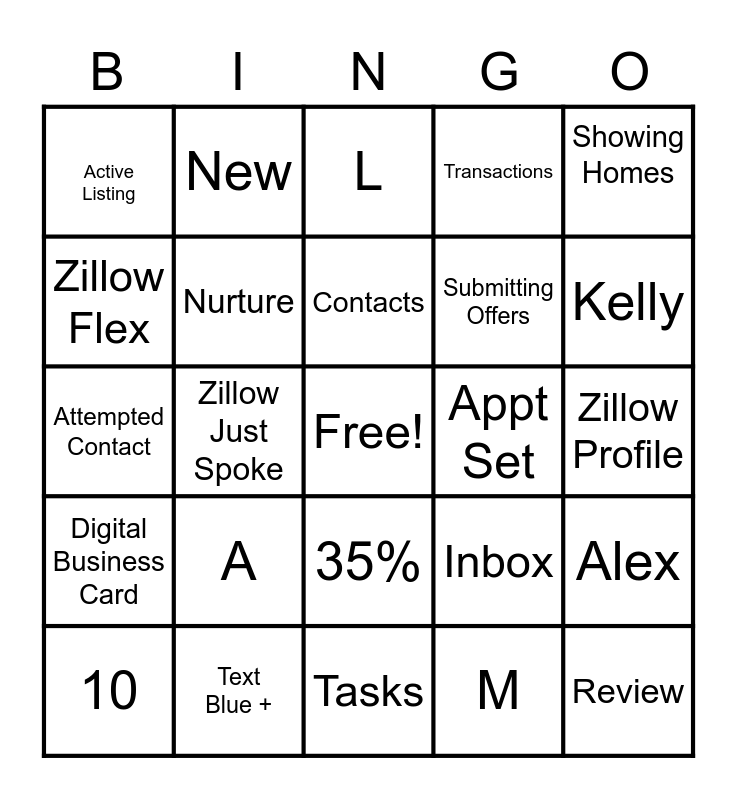This bingo card has a free space and 24 words: A, Text Blue +, Contacts, 10, Showing Homes, Active Listing, Zillow Flex, New, Appt Set, 35%, Submitting Offers, Attempted Contact, Inbox, Alex, Nurture, M, Zillow Profile, L, Kelly, Zillow Just Spoke, Review, Digital Business Card, Transactions and Tasks.