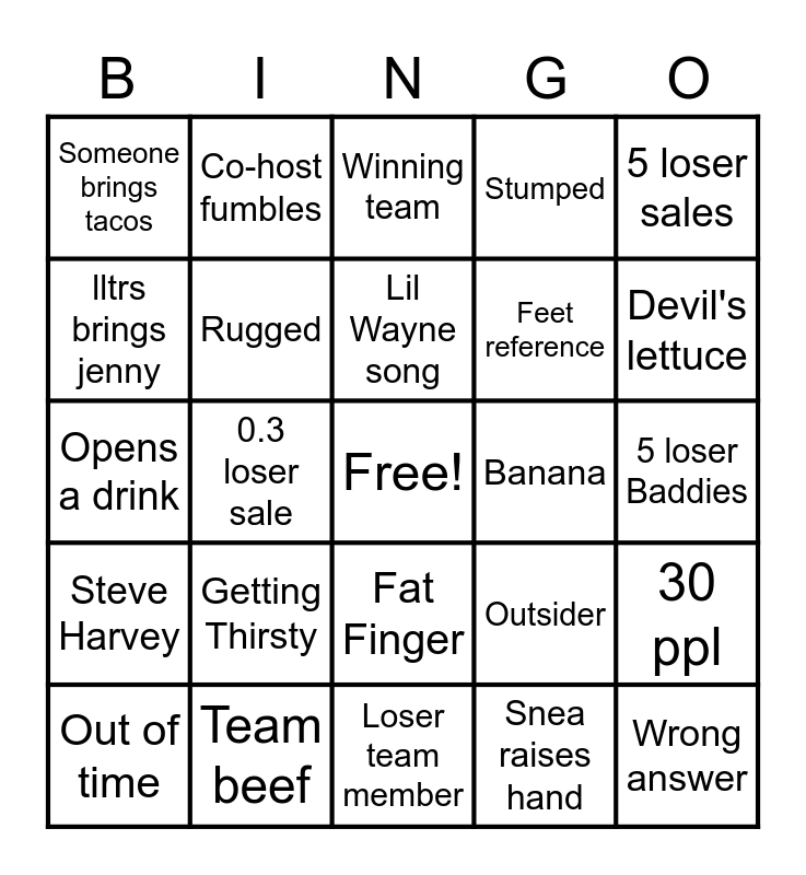This bingo card has a free space and 24 words: Getting Thirsty, Team beef, Lil Wayne song, Out of time, 5 loser sales, Someone brings tacos, lltrs brings jenny, Co-host fumbles, Banana, Fat Finger, Feet reference, Opens a drink, Outsider, 30 ppl, Rugged, Snea raises hand, 5 loser Baddies, Winning team, Devil's lettuce, 0.3 loser sale, Wrong answer, Steve Harvey, Stumped and Loser team member.