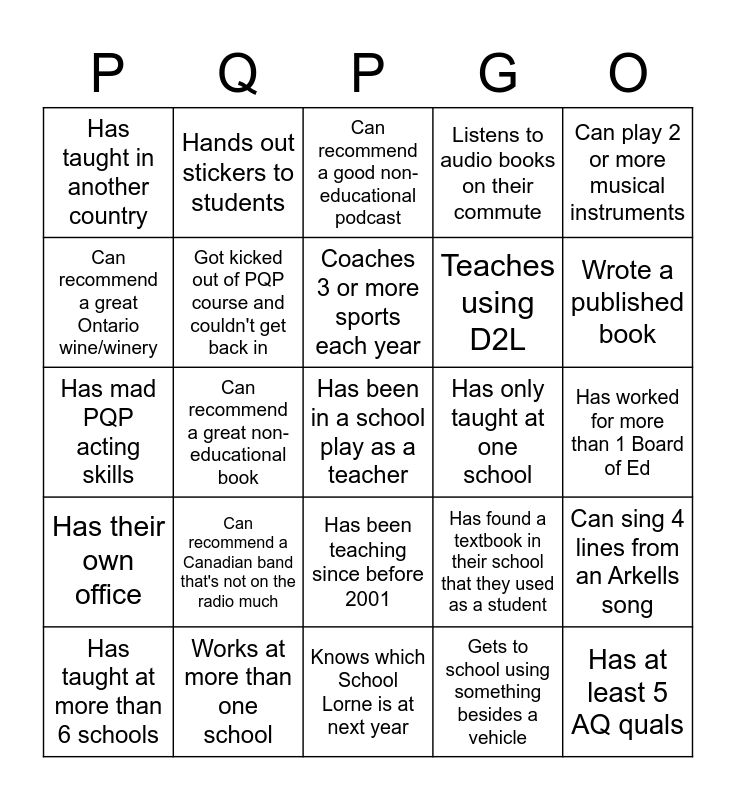 This bingo card has 25 words: Has their own office, Works at more than one school, Has been in a school play as a teacher, Gets to school using something besides a vehicle, Can play 2 or more musical instruments, Has taught in another country, Hands out stickers to students, Can recommend a good non-educational podcast, Has only taught at one school, Can sing 4 lines from an Arkells song, Can recommend a great Ontario wine/winery, Got kicked out of PQP course and couldn't get back in, Knows which School Lorne is at next year, Has found a textbook in their school that they used as a student, Wrote a published book, Has taught at more than 6 schools, Can recommend a great non-educational book, Coaches 3 or more sports each year, Teaches using D2L, Has worked for more than 1 Board of Ed, Has mad PQP acting skills, Can recommend a Canadian band that's not on the radio much, Has been teaching since before 2001, Listens to audio books on their commute and Has at least 5 AQ quals.