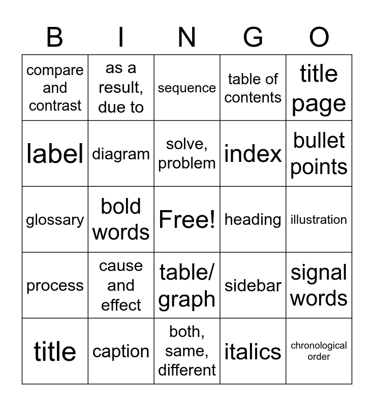This bingo card has a free space and 29 words: title, is, looks like, for example, bold words, photograph, compare and contrast, sequence, diagram, cause and effect, heading, caption, illustration, chronological order, both, same, different, italics, bullet points, first, then, next, table/ graph, process, title page, glossary, sidebar, map, index, label, table of contents, as a result, due to, signal words, solve, problem and enumeration/ listing.