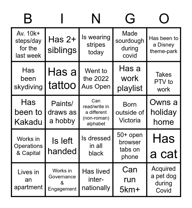 This bingo card has 50 words: Is vegan, Can read/write in a different (non-roman) alphabet, Lives in Darebin, Has lived inter-nationally, Is left handed, Has been bungee-jumping, Has 2+ siblings, Good at escape rooms, Has been skydiving, Has food allergies, Has a tattoo, Made sourdough during covid, Has a cat, 50+ open browser tabs on phone, Has more than 1 passport, Has been to the ballet, Went to the 2022 Aus Open, Born outside of Victoria, Worked at Council for 3yrs+, Has been to a Disney theme-park, Paints/ draws as a hobby, Can run 5km+, Av. 10k+ steps/day for the last week, Has a work playlist, Done a 2000km + road-trip, Acquired a pet dog during Covid, Takes PTV to work, Commutes from regional Vic., Is wearing stripes today, Is dressed in all black, Works in City Sustainability & Strategy, Wears contact lenses, Listens to classical while working, Drinks black coffee, Works in Governance & Engagement, Goes to the gym at least 3xs/week, Has been to the Gold Coast in the last 12 months, Has an international holiday booked (flights purchased), Did renovations in the last 2 years, Owns a holiday home, Is wearing lace-up shoes, Has used a keep-cup today, Enjoys spicy food, Works in Community, Lives in an apartment, Has been to Kakadu, Has visited Uluru, Has climbed the Sydney Harbour Bridge, Works in Operations & Capital and Bought 5+ houseplants during Covid.