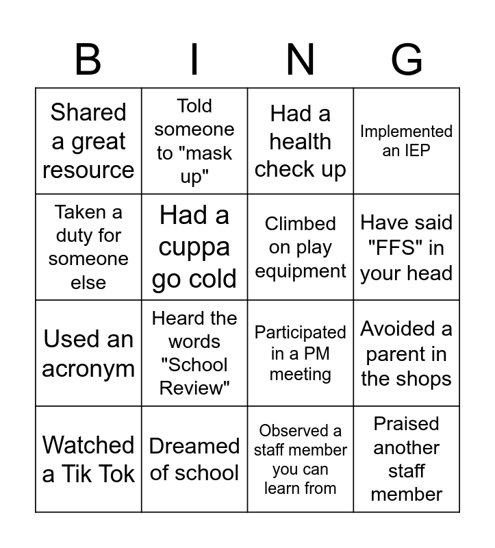 This bingo card has 26 words: Free!, Have seen head lice this year, Have said "FFS" in your head, Thought about retirement, Taken a duty for someone else, Shared a great resource, Had a cuppa go cold, Told someone to "mask up", Observed a staff member you can learn from, Sent an email to the wrong person, Used an acronym, Participated in a PM meeting, Used the SWIVL, Had a parent meeting/conference, Avoided a parent in the shops, Called a student by the wrong name, Implemented an IEP, Praised another staff member, Had a health check up, Watched a Tik Tok, Heard the words "School Review", Slept in, Dreamed of school, Taken a weekend off, Climbed on play equipment and Reminded a student to put their hat on.