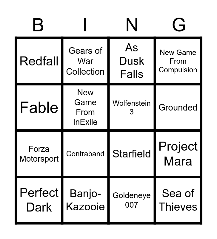 This bingo card has 16 words: Banjo-Kazooie, Project Mara, As Dusk Falls, Redfall, Forza Motorsport, Gears of War Collection, Starfield, Goldeneye 007, Fable, New Game From InExile, Perfect Dark, New Game From Compulsion, Contraband, Grounded, Wolfenstein 3 and Sea of Thieves.