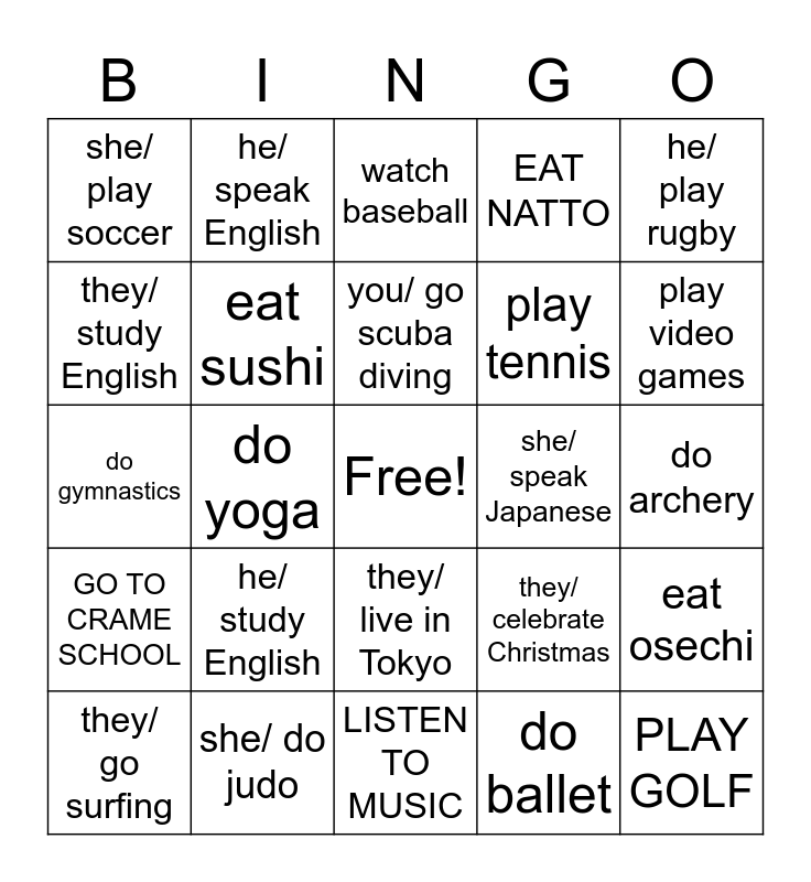 This bingo card has a free space and 24 words: he/ study English, she/ do judo, you/ go scuba diving, they/ go surfing, he/ play rugby, she/ play soccer, they/ study English, he/ speak English, she/ speak Japanese, they/ live in Tokyo, play tennis, do gymnastics, they/ celebrate Christmas, eat osechi, eat sushi, do ballet, do archery, watch baseball, play video games, do yoga, PLAY GOLF, GO TO CRAME SCHOOL, EAT NATTO and LISTEN TO MUSIC.