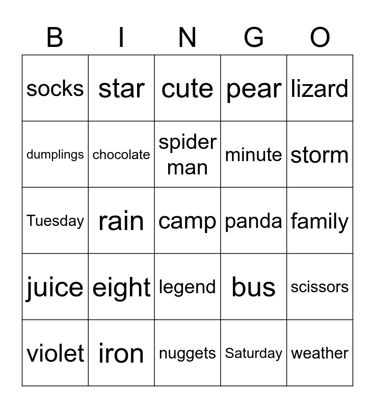This bingo card has a free space and 24 words: eight, iron, spider man, violet, lizard, socks, dumplings, star, panda, legend, minute, Tuesday, bus, scissors, chocolate, Saturday, family, cute, storm, rain, weather, juice, pear and nuggets.