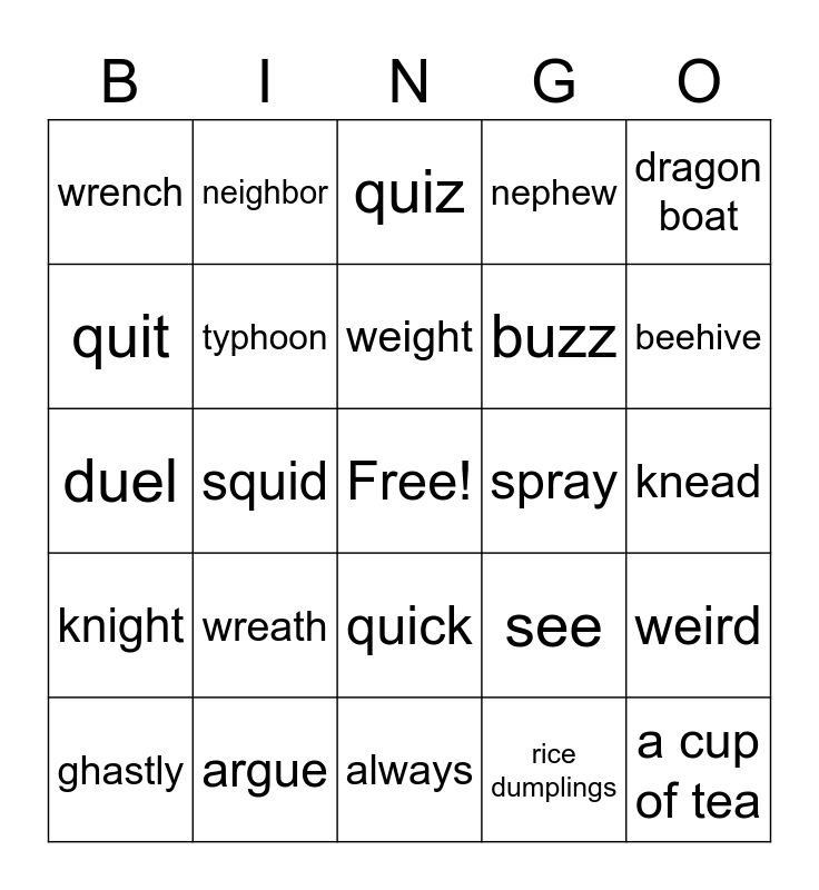 This bingo card has a free space and 24 words: ghastly, wreath, weight, rice dumplings, dragon boat, wrench, neighbor, quiz, spray, knead, duel, typhoon, see, weird, quit, argue, always, nephew, beehive, knight, squid, quick, buzz and a cup of tea.