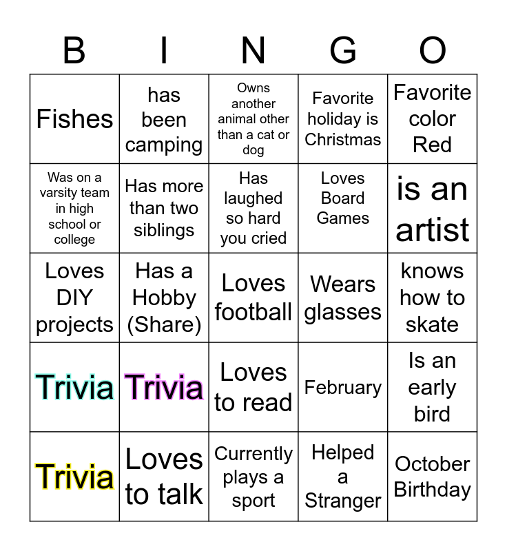 This bingo card has 25 words: Trivia, Currently plays a sport, Has laughed so hard you cried, Trivia, Favorite color Red, Fishes, Was on a varsity team in high school or college, has been camping, Wears glasses, Loves to read, Loves Board Games, Loves DIY projects, February, Is an early bird, Has more than two siblings, October Birthday, knows how to skate, Owns another animal other than a cat or dog, is an artist, Has a Hobby (Share), Loves football, Loves to talk, Trivia, Favorite holiday is Christmas and Helped a Stranger.