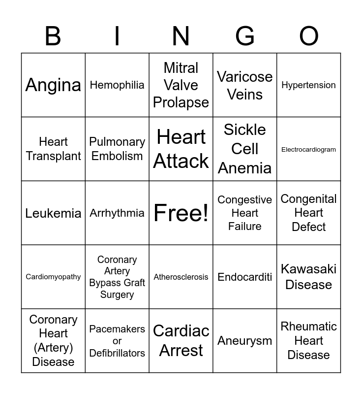 This bingo card has a free space and 24 words: Coronary Artery Bypass Graft Surgery, Pacemakers or Defibrillators, Heart Attack, Coronary Heart (Artery) Disease, Hypertension, Angina, Heart Transplant, Hemophilia, Congestive Heart Failure, Atherosclerosis, Sickle Cell Anemia, Leukemia, Endocarditi, Kawasaki Disease, Pulmonary Embolism, Aneurysm, Congenital Heart Defect, Mitral Valve Prolapse, Electrocardiogram, Arrhythmia, Rheumatic Heart Disease, Cardiomyopathy, Varicose Veins and Cardiac Arrest.
