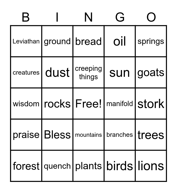 This bingo card has a free space and 42 words: breath, creeping things, Lord, Bless, birds, trees, lions, grass, bread, mountains, stork, goats, rocks, springs, valleys, branches, nests, wisdom, cedars, ground, creatures, ships, sea, Leviathan, moon, seasons, sun, darkness, night, hills, gather, praise, dust, plants, evening, forest, quench, manifold, innumerable, renew, oil and gladden.