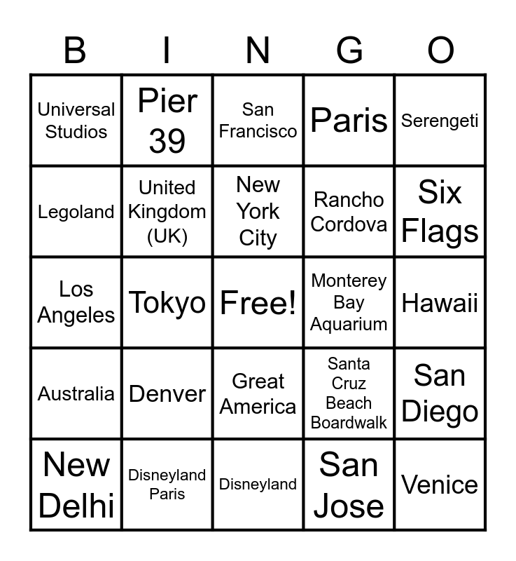 This bingo card has a free space and 25 words: Denver, Disneyland, New York City, New Delhi, Serengeti, Universal Studios, Legoland, Pier 39, Monterey Bay Aquarium, Great America, Rancho Cordova, Los Angeles, Santa Cruz Beach Boardwalk, San Diego, United Kingdom (UK), Mexico, Hawaii, San Francisco, Six Flags, Tokyo, Venice, Disneyland Paris, Australia, Paris and San Jose.