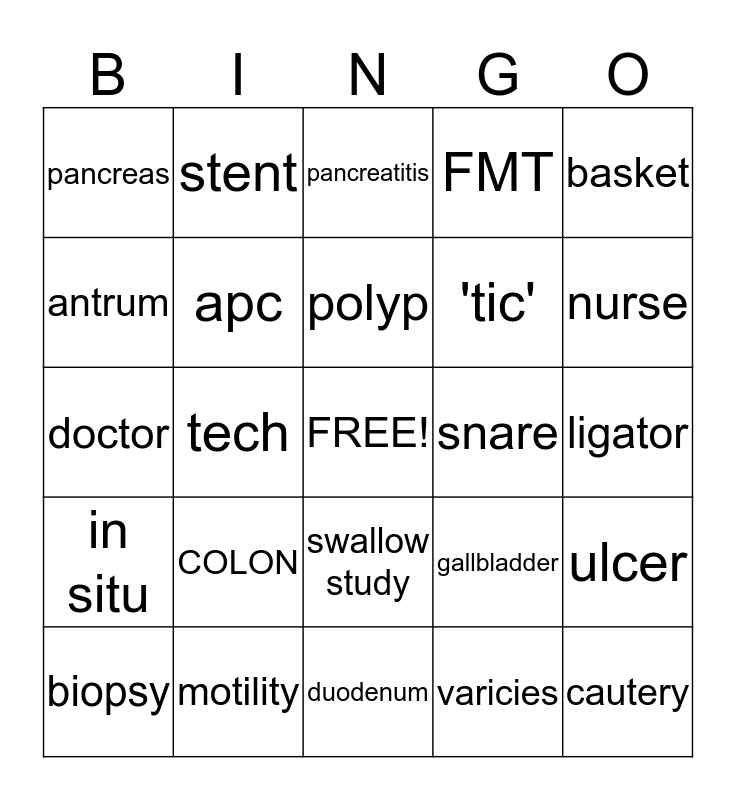 This bingo card has a free space and 24 words: COLON, motility, polyp, biopsy, basket, pancreas, antrum, stent, snare, swallow study, 'tic', doctor, gallbladder, ulcer, apc, varicies, ligator, pancreatitis, nurse, tech, cautery, in situ, FMT and duodenum.