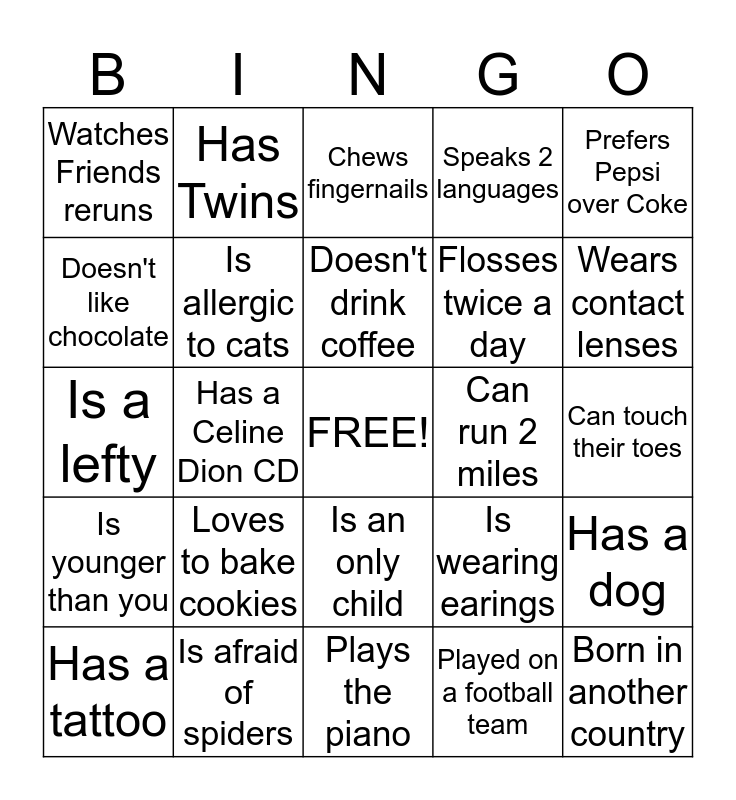 This bingo card has a free space and 24 words: Loves to bake cookies, Is afraid of spiders, Doesn't drink coffee, Has a tattoo, Prefers Pepsi over Coke, Watches Friends reruns, Doesn't like chocolate, Has Twins, Can run 2 miles, Is an only child, Flosses twice a day, Is a lefty, Is wearing earings, Has a dog, Is allergic to cats, Played on a football team, Can touch their toes, Chews fingernails, Wears contact lenses, Has a Celine Dion CD, Born in another country, Is younger than you, Speaks 2 languages and Plays the piano.
