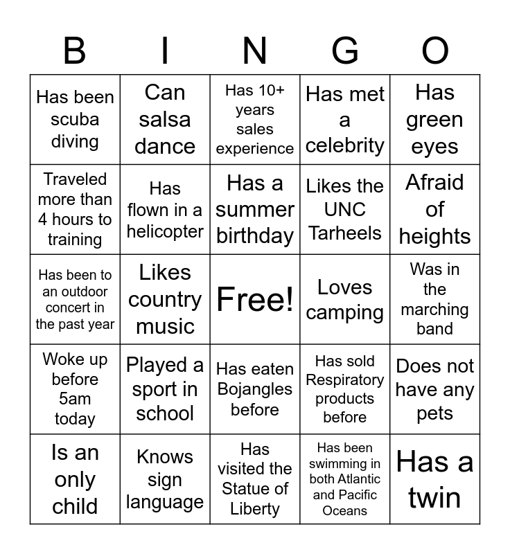 This bingo card has a free space and 24 words: Played a sport in school, Knows sign language, Has a summer birthday, Is an only child, Has green eyes, Has been scuba diving, Traveled more than 4 hours to training, Can salsa dance, Loves camping, Has eaten Bojangles before, Likes the UNC Tarheels, Has been to an outdoor concert in the past year, Has sold Respiratory products before, Does not have any pets, Has flown in a helicopter, Has been swimming in both Atlantic and Pacific Oceans, Was in the marching band, Has 10+ years sales experience, Afraid of heights, Likes country music, Has a twin, Woke up before 5am today, Has met a celebrity and Has visited the Statue of Liberty.
