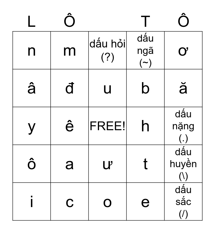 This bingo card has a free space and 24 words: a, c, u, i, ơ, n, â, m, h, ư, b, y, t, dấu huyền (\), đ, e, dấu nặng (.), dấu hỏi (?), ă, ê, dấu sắc (/), ô, dấu ngã (~) and o.
