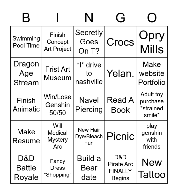 This bingo card has a free space and 24 words: Will Medical Mystery Arc, Fancy Dress "Shopping", *I* drive to nashville, D&D Battle Royale, Opry Mills, Swimming Pool Time, Dragon Age Stream, Finish Concept Art Project, Read A Book, New Hair Dye/Bleach Fun, Yelan., Finish Animatic, Picnic, play genshin with friends, Frist Art Museum, D&D Pirate Arc FINALLY Begins, Adult toy purchase *strained smile*, Secretly Goes On T?, Make website Portfolio, Win/Lose Genshin 50/50, New Tattoo, Make Resume, Crocs and Build a Bear date.