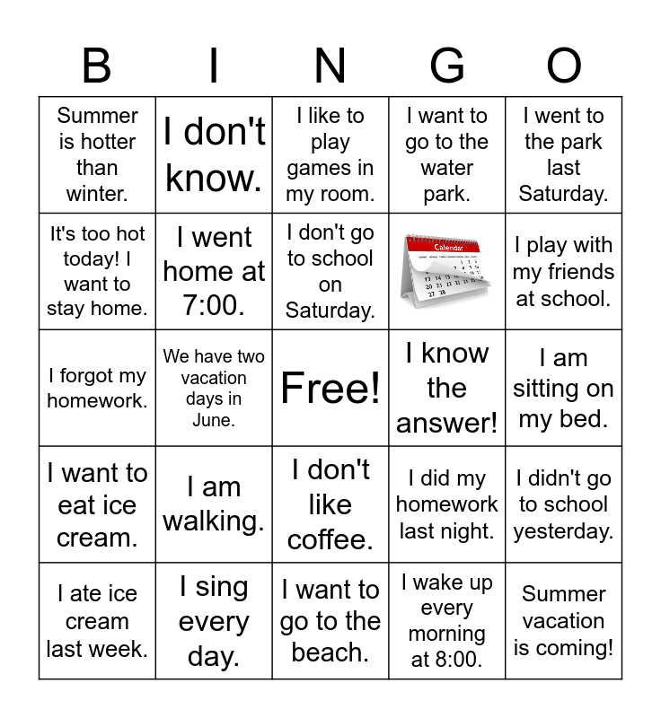 This bingo card has 1 images, a free space and 23 words: I am walking., I sing every day., I don't go to school on Saturday., I ate ice cream last week., I went to the park last Saturday., Summer is hotter than winter., It's too hot today! I want to stay home., I don't know., I know the answer!, I don't like coffee., I forgot my homework., I did my homework last night., I didn't go to school yesterday., I went home at 7:00., I wake up every morning at 8:00., I am sitting on my bed., I like to play games in my room., I play with my friends at school., We have two vacation days in June., Summer vacation is coming!, I want to eat ice cream., I want to go to the water park. and I want to go to the beach..