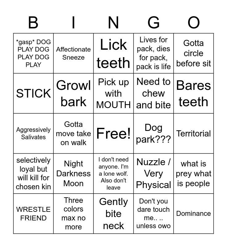 This bingo card has a free space and 24 words: Night Darkness Moon, Three colors max no more, Pick up with MOUTH, WRESTLE FRIEND, Gotta circle before sit, *gasp* DOG PLAY DOG PLAY DOG PLAY, STICK, Affectionate Sneeze, Dog park???, I don't need anyone. I'm a lone wolf. Also don't leave, Need to chew and bite, Aggressively Salivates, Nuzzle / Very Physical, what is prey what is people, Growl bark, Don't you dare touch me.. .. unless owo, Territorial, Lick teeth, Bares teeth, Gotta move take on walk, Dominance, selectively loyal but will kill for chosen kin, Lives for pack, dies for pack, pack is life and Gently bite neck.