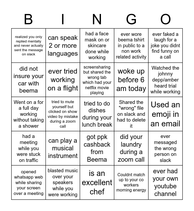 This bingo card has 35 words: missed out on your alarm on a Friday, Still in pajamas at noon on a work day, ever tried to interrupt a period of awkward silence in a zoom meeting, ever tried working on a flight, got ppk cashback from Beema, ever wore beema tshirt in public to a non work related activity, did not insure your car with beema, ever tried to sing to the words of your favourite song while not being on mute in a zoom call, screensharing but shared the wrong tab which had your netflix movie playing, ever used " Can everyone see my screen", Went on a for a full day working without taking a shower, ever faked a laugh for a joke you didnt find funny on a call, ever created a work playlist on spotify, ever had your pet make a guest appearence during your zoom call, realized you only replied mentally and never actually sent the message on slack, Shared the "wrong" file on slack and had to delete it, Couldnt match up to your co workers morning energy, tried to mute yourself but clicked on show video by mistake during a zoom call, had a meeting while you were stuck on traffic, tried to do dishes during your lunch break, did your laundry during a zoom call, opened whatsapp web while sharing your screen over a meeting, ever messaged the wrong person on slack, blasted music over your speakers while you were working, had a face mask on or skincare done while working, Watched the johnny depp/amber heard trial while working, ever had your own youtube channel, pulled an all nighter during a working day, woke up before 6 am today, Used an emoji in an email, shared a meme/Gif with your co worker today, is an excellent chef, can play a musical instrument, can speak 2 or more languages and knows the moves of macarena.