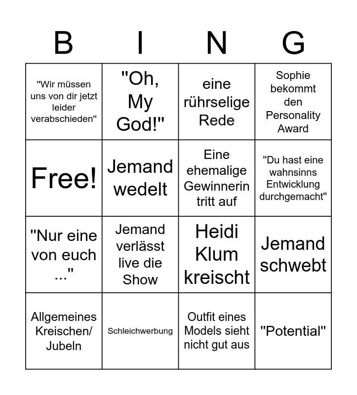 This bingo card has 16 words: Schleichwerbung, Jemand schwebt, eine rührselige Rede, ''Wir müssen uns von dir jetzt leider verabschieden'', ''Nur eine von euch ...'', ''Oh, My God!'', Heidi Klum kreischt, Outfit eines Models sieht nicht gut aus, Free!, Jemand wedelt, Allgemeines Kreischen/ Jubeln, Sophie bekommt den Personality Award, Jemand verlässt live die Show, ''Du hast eine wahnsinns Entwicklung durchgemacht'', Eine ehemalige Gewinnerin tritt auf and ''Potential''.