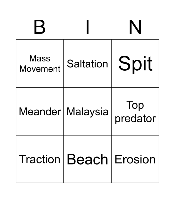 This bingo card has a free space and 11 words: Biomass, Beach, Erosion, Traction, Saltation, Spit, Top predator, Ox-bow lake, Meander, Mass Movement and Cross profile.