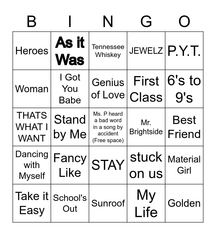 This bingo card has a free space and 24 words: Fancy Like, School's Out, Genius of Love, Take it Easy, P.Y.T., Heroes, Woman, As it Was, Mr. Brightside, STAY, First Class, THATS WHAT I WANT, stuck on us, Material Girl, I Got You Babe, My Life, Best Friend, Tennessee Whiskey, 6's to 9's, Stand by Me, Golden, Dancing with Myself, JEWELZ and Sunroof.
