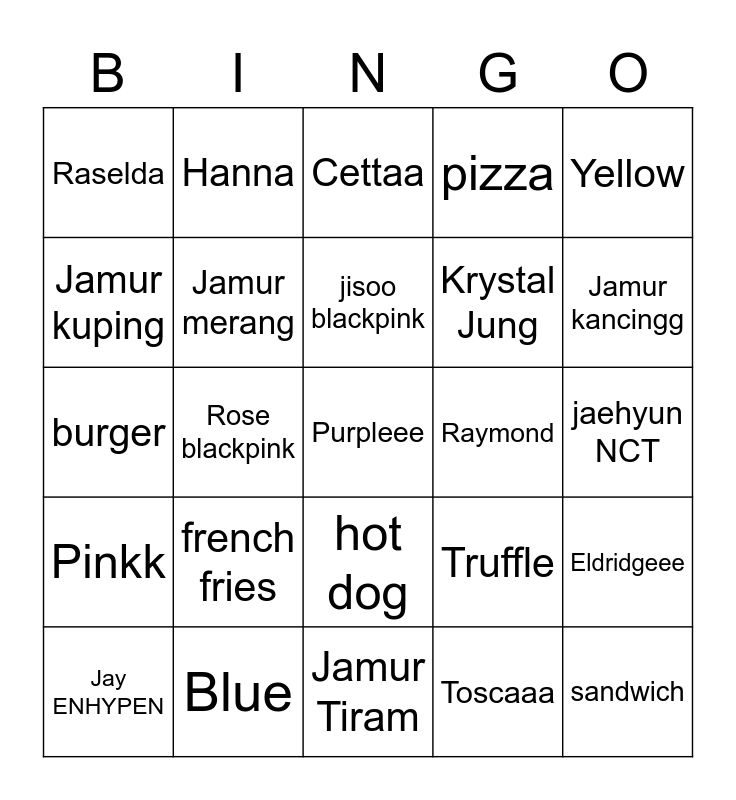 This bingo card has 25 words: Pinkk, Blue, Purpleee, Toscaaa, Yellow, Raselda, Hanna, Cettaa, Raymond, Eldridgeee, Jamur kuping, Jamur merang, Jamur Tiram, Truffle, Jamur kancingg, Jay ENHYPEN, Rose blackpink, jisoo blackpink, Krystal Jung, jaehyun NCT, burger, french fries, hot dog, pizza and sandwich.