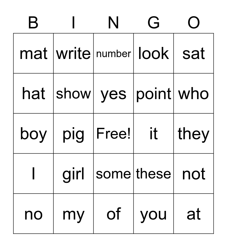 This bingo card has a free space and 59 words: name, my, am, I, you, is, show, me, point, this, look, the, hat, ham, fat, mat, at, sat, school, yes, it, number, no, not, tomorrow, time, day, what, who, look, can, that, answer, read, write, play, pin, pig, sit, boy, she, girl, they, we, he, a, an, are, some, of, food, don't, good, like, and, these, those, mop and pot.