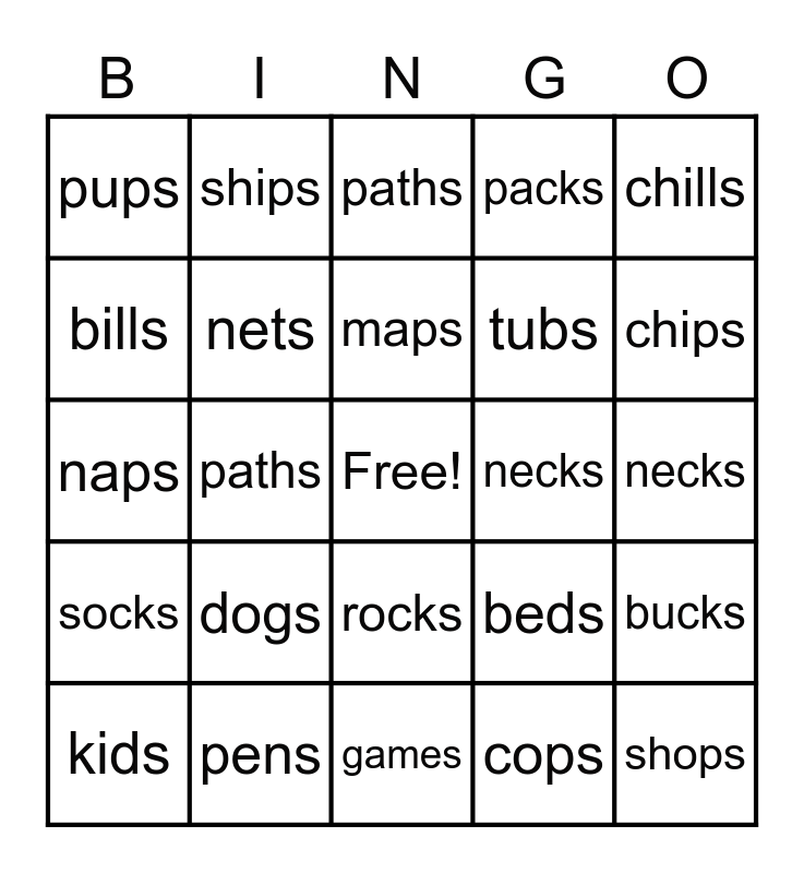 This bingo card has a free space and 24 words: dogs, pens, maps, kids, chills, pups, bills, ships, necks, rocks, tubs, naps, beds, bucks, nets, cops, necks, paths, chips, paths, shops, socks, packs and games.