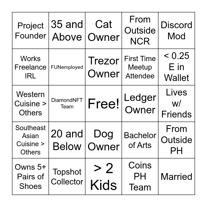 This bingo card has a free space and 50 words: Single, Married, 1-2 Kids, > 2 Kids, 20 and Below, 21 and Above, 35 and Above, Works in Finance IRL, Works Freelance IRL, Still in Uni, FUNemployed, From Outside NCR, From Outside PH, Bachelor of Arts, Bachelor of Science, Masters Degree, Trezor Owner, Ledger Owner, NFT Artist, Discord Mod, DiamondNFT Team, Coins PH Team, Project Founder, First Time Meetup Attendee, 1000+ Twitter Followers, < 100 Twitter Followers, < 0.25 E in Wallet, > 1 E in Wallet, Cat Owner, Dog Owner, Tezos Virgin, Solana Virgin, P2E Player, P2E Virgin, Topshot Collector, Topshot Virgin, Basketball > Others, Basketball < Others, Lives w/ Family, Lives w/ Friends, Lives Alone, Beach > Mountains, Beach < Mountains, Owns 2-4 Pairs of Shoes, Owns 5+ Pairs of Shoes, Western Cuisine > Others, Middle Eastern Cuisine > Others, East Asian Cuisine > Others, Southeast Asian Cuisine > Others and Latin Cuisine > Others.