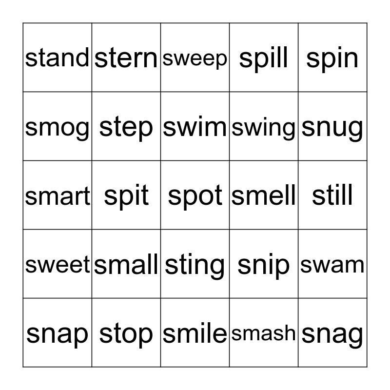 This bingo card has a free space and 24 words: small, stop, swim, snap, spin, stand, smog, stern, smell, sting, swing, smart, snip, swam, step, smash, still, sweep, snug, spit, snag, sweet, spill and smile.