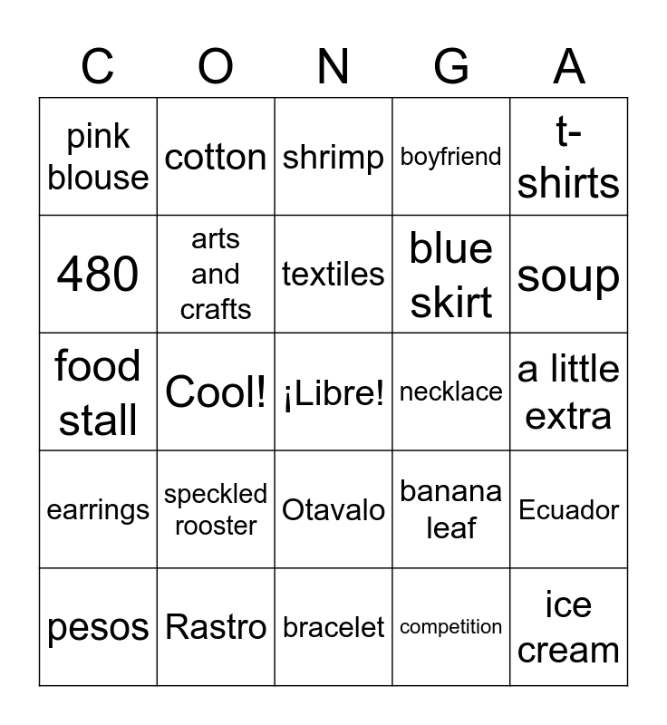 This bingo card has a free space and 29 words: pesos, meat, Cool!, to bargain, pink blouse, shrimp, arts and crafts, speckled rooster, necklace, Rastro, a little extra, ice cream, bracelet, competition, soup, popsicles, Otavalo, earrings, t-shirts, food stall, banana leaf, llamas, blue skirt, 480, boyfriend, cotton, Ecuador, textiles and Costa Rica.