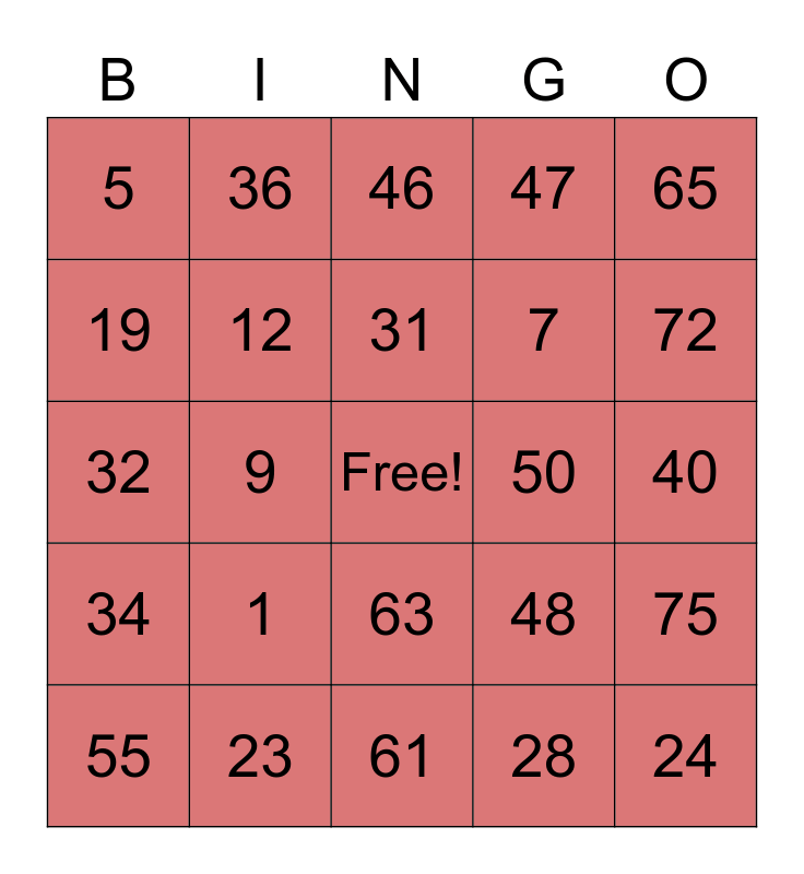This bingo card has a free space and 24 words: 1, 23, 31, 55, 65, 5, 19, 36, 50, 63, 7, 32, 48, 75, 12, 28, 40, 46, 72, 9, 24, 34, 47 and 61.