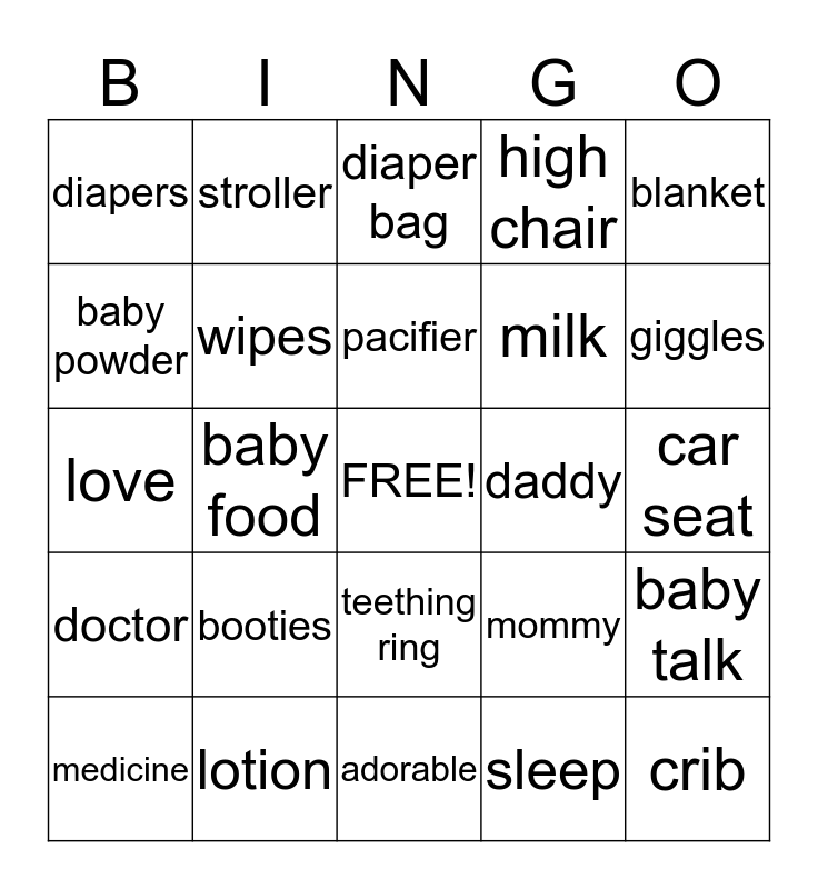 This bingo card has a free space and 24 words: booties, lotion, pacifier, medicine, blanket, diapers, baby powder, stroller, daddy, teething ring, milk, love, mommy, baby talk, wipes, sleep, car seat, diaper bag, giggles, baby food, crib, doctor, high chair and adorable.