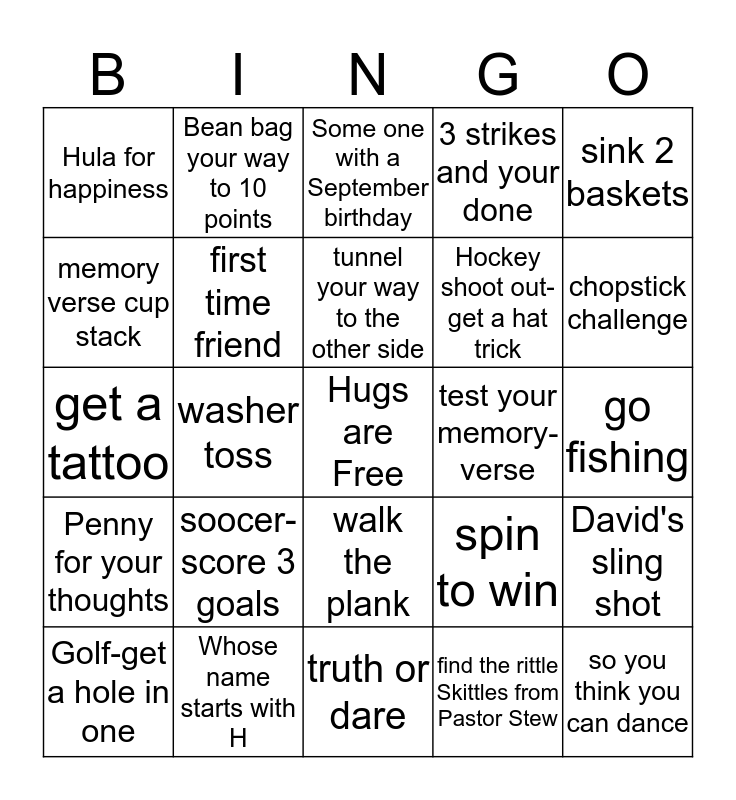 This bingo card has a free space and 24 words: soocer- score 3 goals, Whose name starts with H, tunnel your way to the other side, Golf-get a hole in one, sink 2 baskets, Hula for happiness, memory verse cup stack, Bean bag your way to 10 points, test your memory-verse, walk the plank, Hockey shoot out- get a hat trick, get a tattoo, spin to win, David's sling shot, first time friend, find the rittle Skittles from Pastor Stew, go fishing, Some one with a September birthday, chopstick challenge, washer toss, so you think you can dance, Penny for your thoughts, 3 strikes and your done and truth or dare.