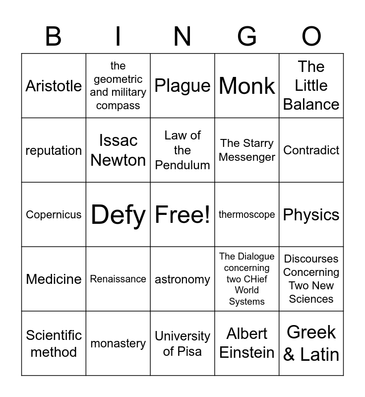 This bingo card has a free space and 24 words: Renaissance, monastery, Law of the Pendulum, Scientific method, The Little Balance, Aristotle, reputation, the geometric and military compass, thermoscope, astronomy, The Starry Messenger, Copernicus, The Dialogue concerning two CHief World Systems, Discourses Concerning Two New Sciences, Issac Newton, Albert Einstein, Physics, Plague, Contradict, Defy, Greek & Latin, Medicine, Monk and University of Pisa.