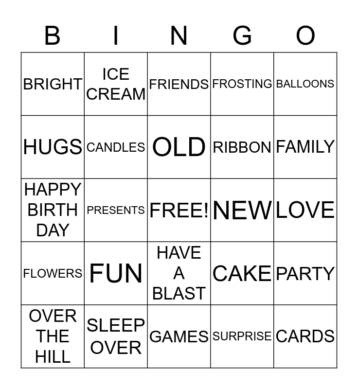 This bingo card has a free space and 24 words: FUN, SLEEP OVER, OLD, OVER THE HILL, BALLOONS, BRIGHT, HUGS, ICE CREAM, NEW, HAVE A BLAST, RIBBON, HAPPY BIRTH DAY, CAKE, PARTY, CANDLES, SURPRISE, LOVE, FRIENDS, FAMILY, PRESENTS, CARDS, FLOWERS, FROSTING and GAMES.
