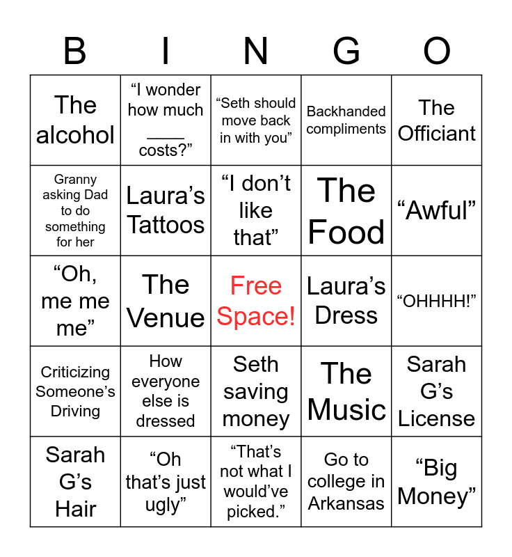 This bingo card has a free space and 24 words: Sarah G’s Hair, How everyone else is dressed, “I don’t like that”, Go to college in Arkansas, The Officiant, The alcohol, “I wonder how much ____ costs?”, “Seth should move back in with you”, Laura’s Dress, “OHHHH!”, “Oh, me me me”, Laura’s Tattoos, The Music, Sarah G’s License, Granny asking Dad to do something for her, “Oh that’s just ugly”, “That’s not what I would’ve picked.”, Backhanded compliments, “Awful”, Criticizing Someone’s Driving, The Venue, Seth saving money, The Food and “Big Money”.