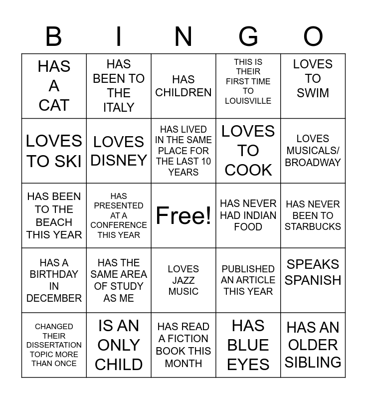 This bingo card has a free space and 24 words: HAS THE SAME AREA OF STUDY AS ME, IS AN ONLY CHILD, HAS LIVED IN THE SAME PLACE FOR THE LAST 10 YEARS, CHANGED THEIR DISSERTATION TOPIC MORE THAN ONCE, LOVES TO SWIM, HAS A CAT, LOVES TO SKI, HAS BEEN TO THE ITALY, HAS NEVER HAD INDIAN FOOD, LOVES JAZZ MUSIC, LOVES TO COOK, HAS BEEN TO THE BEACH THIS YEAR, PUBLISHED AN ARTICLE THIS YEAR, SPEAKS SPANISH, LOVES DISNEY, HAS BLUE EYES, HAS NEVER BEEN TO STARBUCKS, HAS CHILDREN, LOVES MUSICALS/ BROADWAY, HAS PRESENTED AT A CONFERENCE THIS YEAR, HAS AN OLDER SIBLING, HAS A BIRTHDAY IN DECEMBER, THIS IS THEIR FIRST TIME TO LOUISVILLE and HAS READ A FICTION BOOK THIS MONTH.