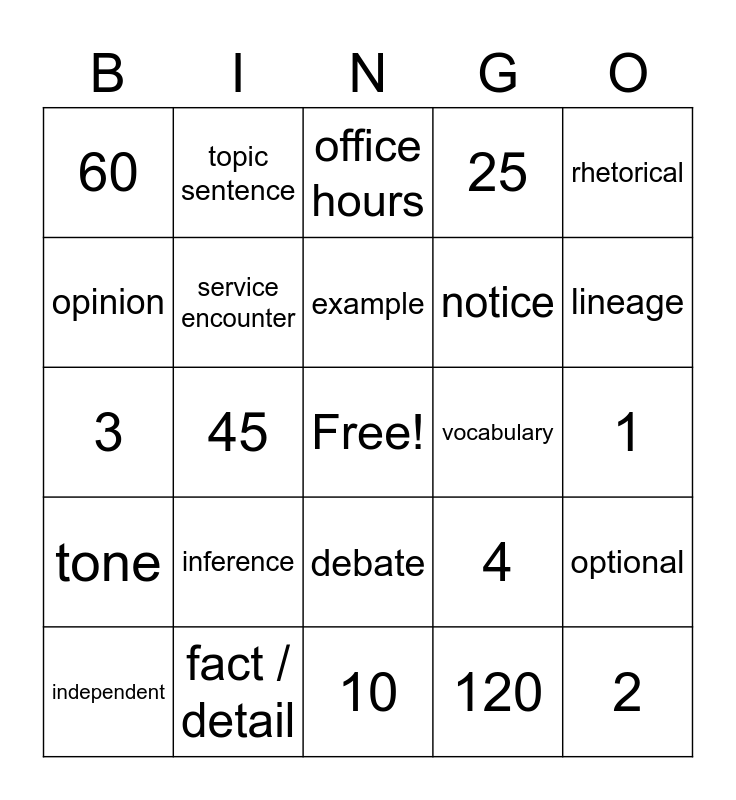 This bingo card has a free space and 29 words: independent, integrated, 45, 30, 60, office hours, service encounter, inference, vocabulary, fact / detail, 1, 2, 10, 120, lineage, mutual, debate, tone, rhetorical, 3, 4, lecture, notice, opinion, 25, topic sentence, optional, example and 54.