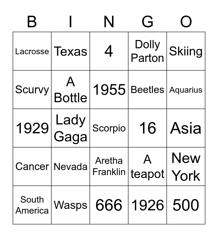 This bingo card has 25 words: Nevada, 666, 1955, South America, Skiing, Lacrosse, Scurvy, Texas, 16, Aretha Franklin, Beetles, 1929, A teapot, New York, A Bottle, 500, Asia, 4, Aquarius, Lady Gaga, Scorpio, Wasps, Cancer, Dolly Parton and 1926.