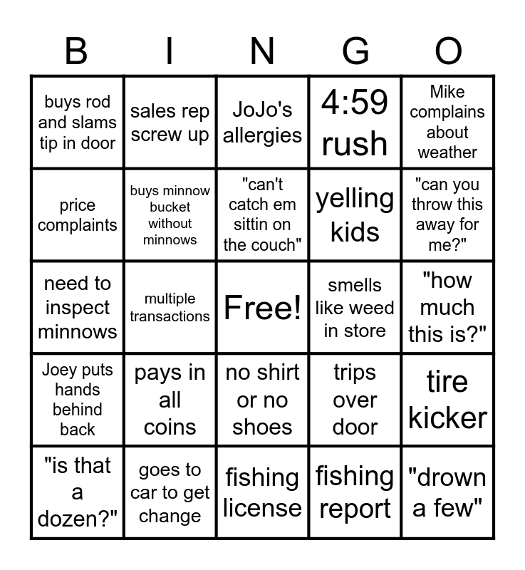 This bingo card has a free space and 29 words: "is that a dozen?", Luke visit, multiple transactions, Cat Daddy, buys rod and slams tip in door, JoJo's allergies, buys minnow bucket without minnows, pays in all coins, smells like weed in store, goes to car to get change, "how much this is?", "drown a few", fishing license, fishing report, "can you throw this away for me?", neck tattoo, no shirt or no shoes, Joey puts hands behind back, Mike complains about weather, need to inspect minnows, trips over door, shows picture of fish, yelling kids, price complaints, 4:59 rush, sales rep screw up, tire kicker, "can't catch em sittin on the couch" and "must be free".
