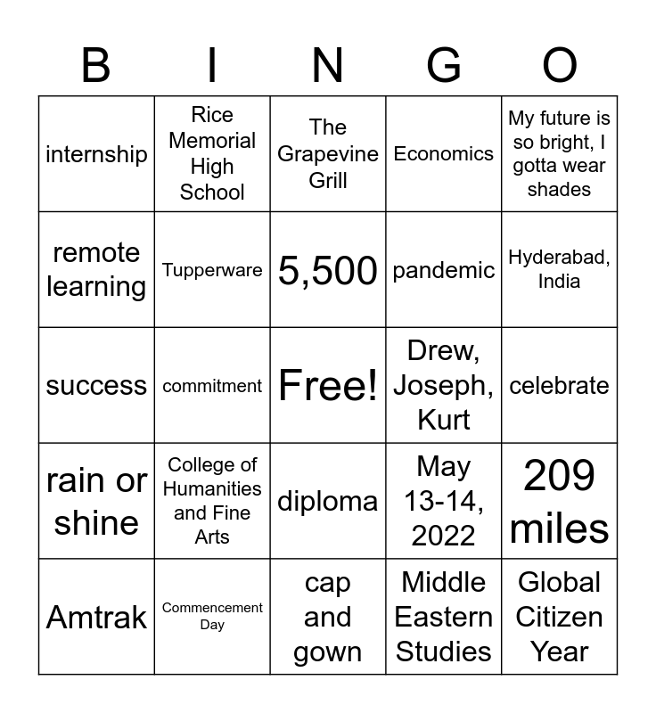 This bingo card has a free space and 44 words: U Mass Amherst, Global Citizen Year, Class of 2022, Amtrak, Planet Fitness, Middle Eastern Studies, The Grapevine Grill, Amherst, My future is so bright, I gotta wear shades, Commencement Day, Economics, Drew, Joseph, Kurt, diploma, College of Humanities and Fine Arts, Arabic, cap and gown, Beqaa Valley, Lebanon, success, College of Social &Behavioral Sciences, Hyderabad, India, Rice Memorial High School, VT State Parks-Burton Island, Shaw's Supermarket, internship, Salam LADC, celebrate, March 16, 1999, McGuirk Stadium, May 13-14, 2022, rain or shine, Congressman Jim McGovern, 209 miles, 3 hours and 30 minutes, perseverance, commitment, late for class, road trip, congratulations, 5,500, remote learning, pandemic, 5 college consortium, Tupperware and testing twice a week.