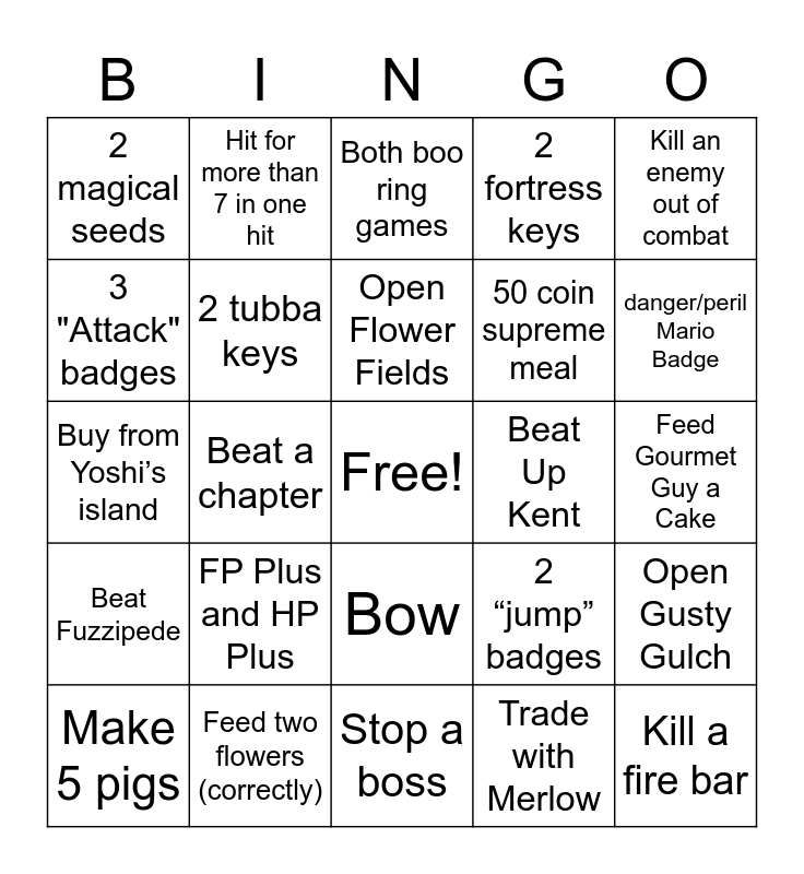 This bingo card has a free space and 86 words: Kooper, Bombette, Bow, Watt, Sushi, Lakilester, Beat Buzzar, Beat Blooper, Beat Electro Blooper, Beat Super Blooper, Switch Bridge #2, Open Dry Dry Ruins, Open Gusty Gulch, Feed Gourmet Guy a Cake, Ralph Cutscene, Open Flower Fields, Clothe Both Snowmen, Buy from shroom grocery, Buy from Harry’s shop, Buy from Koopa Village, Buy from Dry Dry Outpost, Buy from Boo’s Mansion, Buy from Yoshi’s island, Buy From Shiver City, Trade with Merlow, Super Boots, Super Hammer, Repair all Toy Train Tracks, Save all yoshis, Feed the Well creature any berry, Feed two flowers (correctly), FP PLus, HP PLus, FP Plus and HP Plus, 3 "Attack" badges, Power or Defense Plus, danger/peril Mario Badge, “Charge” Badge, "Power” badge, Beat a chapter, Win an encounter turn 1, Sell an item for at least 60 coins, Buy an item worth at least 30 coins, Beat Up Kent, Super Rank 5 Partners, Kill an enemy out of combat, LUCKY!, Hit for more than 7 in one hit, Make peace with whakka, Deliver three letters, Buy 8 Rip Cheato items, Beat Jr. in the Harbor or the Forever Forest., Beat Fuzzipede, Save Koopa Village, Beat Dojo Master 1, Hold 15 star pieces, Give Moustafa a lemon, 50 coin supreme meal, 2 fortress keys, 2 tubba keys, 2 magical seeds, 2 Ruins keys, All chomp room items, Defeat an amazee dayzee, Action command a monstar attack, Both boo ring games, Talk to a clubba, Kill a fire bar, Retrieve x koopa shells (count all collectable), Exploit an elemental weakness, Eat an ultra shroom, Buy 1 of everything from a shop., Make 5 pigs, Sleep a boss, Dizzy a boss, Shock a boss, Stop a boss, Slot machine “win”, Use a terrain feature in combat, BP cost 1-4, BP cost 5-8, Max hp 20+, Max Fp 20+, 2 “smash” badges, 2 “jump” badges and 2 “stomp” badges.
