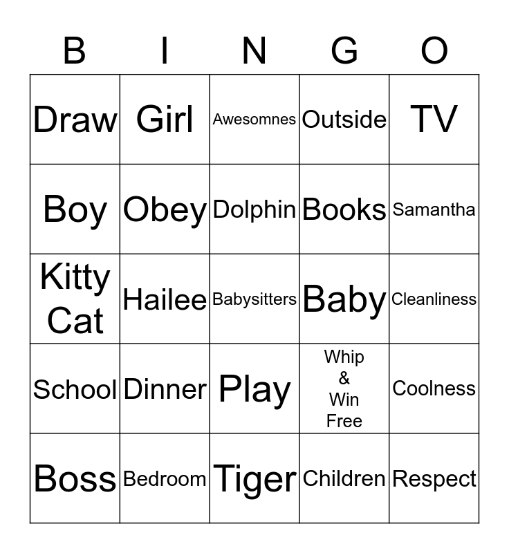 This bingo card has 25 words: Dinner, Tiger, Dolphin, Boss, TV, Draw, Boy, Girl, Baby, Play, Books, Kitty Cat, Whip & Win Free, Coolness, Obey, Respect, Cleanliness, Awesomnes, Samantha, Hailee, Babysitters, Bedroom, School, Outside and Children.