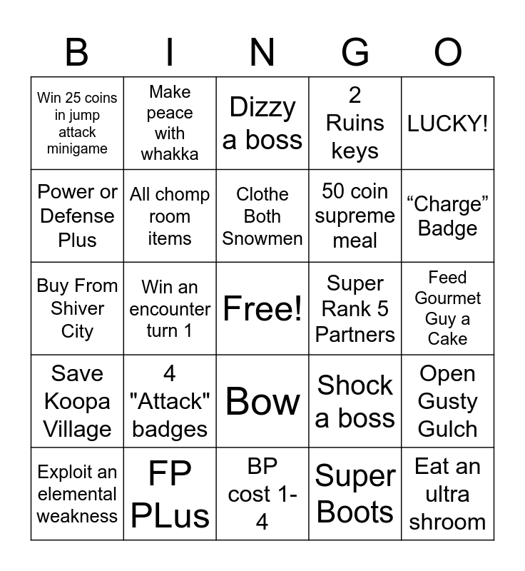 This bingo card has a free space and 87 words: Kooper, Bombette, Bow, Watt, Sushi, Lakilester, Beat Buzzar, Beat Blooper, Beat Electro Blooper, Beat Super Blooper, Switch Bridge #2, Open Dry Dry Ruins, Open Gusty Gulch, Feed Gourmet Guy a Cake, Ralph Cutscene, Clothe Both Snowmen, Buy from shroom grocery, Buy from Harry’s shop, Buy from Koopa Village, Buy from Dry Dry Outpost, Buy from Boo’s Mansion, Buy from Yoshi’s island, Buy From Shiver City, Trade with Merlow, Super Boots, Super Hammer, Repair all Toy Train Tracks, Save all yoshis, Feed the Well creature any berry, Feed two flowers (correctly), FP PLus, HP PLus, FP Plus and HP Plus, 4 "Attack" badges, Power or Defense Plus, danger/peril Mario Badge, “Charge” Badge, "Power” badge, Beat a chapter, Win an encounter turn 1, Sell an item for at least 60 coins, Buy an item for at least 30 coins, Beat Up Kent, Super Rank 5 Partners, Kill an enemy out of combat, LUCKY!, Hit for more than 7 in one hit, Make peace with whakka, Deliver three letters, Buy 8 Rip Cheato items, Beat Jr. in the Harbor or the Forever Forest., Beat Fuzzipede, Save Koopa Village, Beat Dojo Master 1, Hold 15 star pieces, Give Moustafa a lemon, 50 coin supreme meal, 2 fortress keys, 2 tubba keys, 2 Ruins keys, All chomp room items, Defeat an amazee dayzee, Action command a monstar attack, Both boo ring games, Talk to a clubba, Kill a fire bar, Reshell 4 koopas, Exploit an elemental weakness, Eat an ultra shroom, Buy 1 of everything from a shop., 5 lil oinks, Sleep a boss, Dizzy a boss, Shock a boss, Stop a boss, Slot machine “win”, Use a terrain feature in combat, BP cost 1-4, BP cost 5-8, Max hp 20+, Max Fp 20+, 2 “smash” badges, 2 “jump” badges, 2 “stomp” badges, 3 0 cost badges, Win 25 coins in jump attack minigame and Win 25 coins in smash attack minigame.